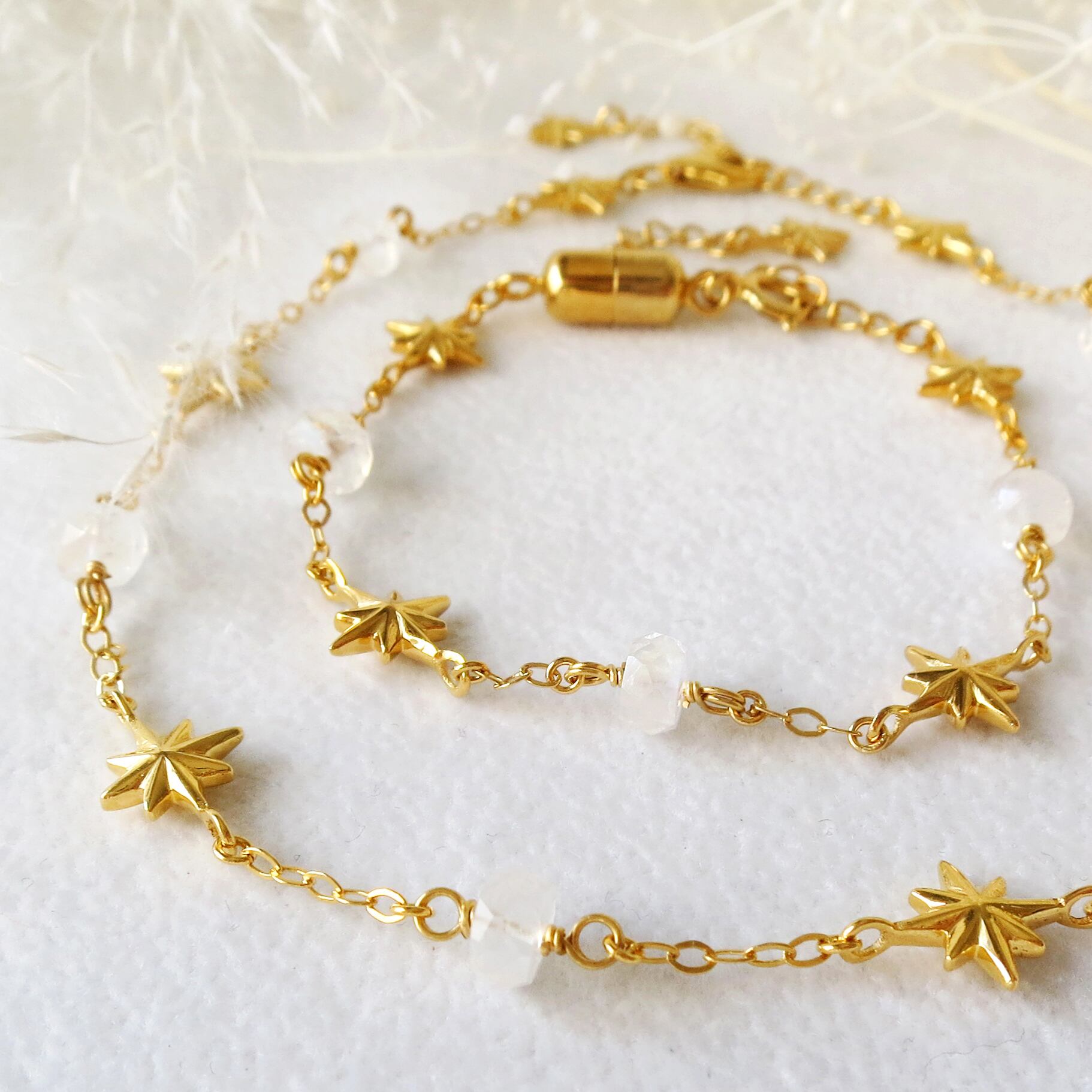 壮大な大自然で育まれたキラキラとしたムーンストーンとその煌めきのモチーフが交互に足元を彩るステーションのアンクレット。